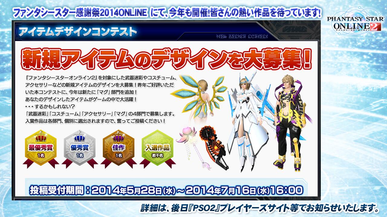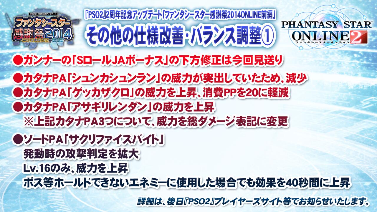 PSO2放送局#20は第20回記念という事で3時間の放送 候補生の近況報告とかもある長丁場 放送内容のポイントをピックアップ 20回記念という事で第1回を振り返る 酒井P「フサフサだったころw」 視聴者プレゼントロビーアクション sm23649671 【PSO2】視聴者プレゼントロビーアクション キーワードは「つゆたろう」 ![]() イチタロー2は待機モーション 女性も一太郎さんがやったのでちょっとガニ股 女性の待機モーションはエノモト3がいいかも 「アークス候補生!」進捗状況を紹介 酒井Pの出した課題は3人ともクリアしたので 一太郎さんが水着になりました 誰得w アークス候補生の次の課題は VHTAをナベリウス2をソロで15分でクリア マタボ8章ぐらいまでをクリア(努力目標) 皆さんの大好きなナベ2w 菅沼Dに聞け! 候補生からの質問(と言う体) マグの育て方 ![]() ![]() 公式で特化マグをお勧め 菅沼Dは4つの特化マグを作ってある ブレイバーを想定して技量マグも作ってあった 菅沼Dは開発陣で一番のやり込みじゃないか マグ周りは細かすぎて 多分候補生は解ってないな・・・ ユニットは何を装備すればいいですか ![]() 同種防具で+αの効果があるセット効果の解説 見た目が同じようなシリーズをそろえればいいというのは解り易い説明 アイテムパックや倉庫がすぐにいっぱいになる ![]() ![]() ある意味これが一番大事で実戦的 強い武具を残すためにまさかの自動装備押し この機能はあまり使われてないって、それは使えないからじゃ・・・ 「ファンタシースター感謝祭2014ONLINE前編」Part1 sm23650147 【PSO2】ファンタシースター感謝祭2014ONLINE前編 PV【フルHD】 うらら服はヘアスタイルは別、インカムも別 うららのボイスチケットは無し クラフトレベル50解放 テクニックカスタマイズ レベル3 武装クラフトのリセットレシピ ただしオーナー登録は解除されない チーム合併 100人の上限は変わらない 少人数のチーム合併を想定 デイリーオーダーの条件緩和 討伐系とクエストクリア系は人気が無いので緩和 具体的には3の物を1に(報酬は据え置き) DFエルダーにも記念写真 2周年記念イベント シーのCOや2周年ビンゴ、WEB連動イベント WEB連動イベントはビンゴでは無く単純にクエストクリア数 ただしクエストクリア数の累計数での報酬では無く 毎週ごとに報酬と目標が出て達成するタイプ 期間限定クエスト「静寂に生まれし混沌」(常設クエスト) 新エネミー有翼系ダーカー ダブリューネとダブリュンダ ランズヴァレーダ 中型まででボスは無し ボスのみレベル+5でSHは70のボスが出る ここが超大切 その他の仕様改善、バランス調整 ![]() ガンナーの下方修正は「今回は」なし 数か月後に全ツリーを含めた大きな修正をするので、その時にする カタナPA「シュンカシュンラン」は下方修正 カタナPAは総ダメージ表記に修正 実は「シュンカシュンラン」初段の威力しか表示されていない ツリーはツリーリセットパスの配布があるからかもしれない サクリファイスバイトw 1段目で40秒に修正 一太郎「その内ファイターとかもどうにかしてくれると思いますよ」 ![]() アポスドリオスは倒した数の集計では無く 倒したプレイヤー数の集計 12人がソロで倒しても 12人でマルチで倒しても同じポイントになる アポスドリオスのポイントはスーパーハードはノーマルの4倍 「採掘基地防衛線:侵入」は「襲来」と同様の必要Ptに修正 エフェクト修正は 具体的にはイル・フォイエとコスモスブレイカー イル・フォイエはSEも修正 sm23650233 【PSO2】新イベントシステムアークスシップ対抗戦 ロードマップに合った新システム 同盟シップと組んで10シップを5グループに分かれる 同盟シップは人数では無くDFの結果などから判断 開催期間は10日間でその間は組み合わせは変わらない 午前中と午後で2回集計 アカウントごとの計算 何か月か毎に対抗戦 貯めたスターでアイテム購入 順位で購入できるアイテムが良くなる アークマのCVは諏訪部順一さん アークマが人気でたらなんか作りたい m23650403 【PSO2】シャイニングコラボ第2弾 PV【フルHD】 ![]() 今回はボイス付き PSO2es ![]() ![]() 緊急クエスト15分前告知のプッシュ通知は全ユーザー対象 プレミアムは1時間前通知も準備中 プッシュ通知はゲームを立ち上げてなくてもお知らせ機能の事 ![]() セガコラボも解放後は絵が変わる ![]() 『PSO2』で遊んじゃおう! 今回は2本立て 1本目は6/11配信の期間限定クエスト「静寂に生まれし混沌」をプレイ 今回は一太郎君+あっちゃん+アークス候補生の5人でプレイ 新エネミーも少し登場 2本目は一太郎チャレンジ アークスGP2014で使用される予選クエスト 一太郎君が一度も戦闘不能にならない&10分以内にクリアを達成すれば、 23時からの緊急クエストにレアドロップ倍率&経験値+100%でしたが 一太郎君が戦闘不能になってしまいました。 10分以内にクリアは達成したのでレアドロップ倍率+50%&経験値+50%に 思ったよりアークス候補生が活躍していた アークス候補生はレベルが高く装備が強いキャラを使ったというの
