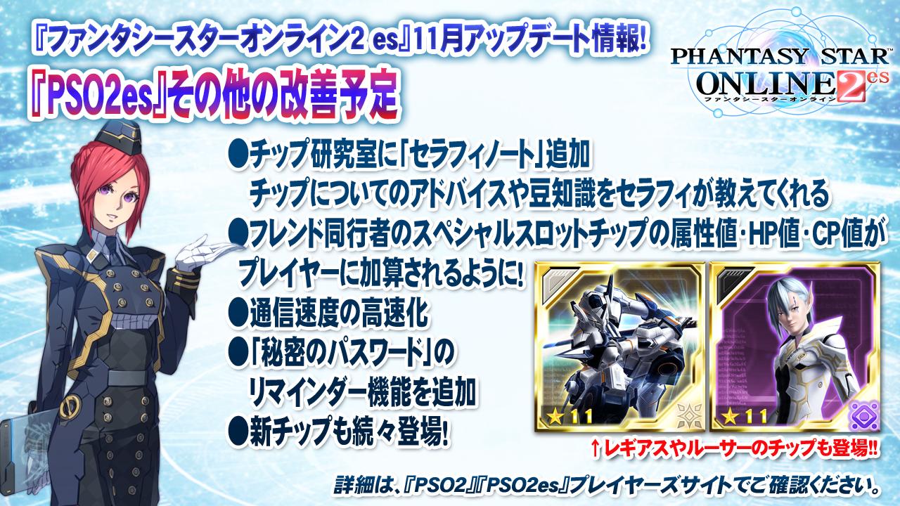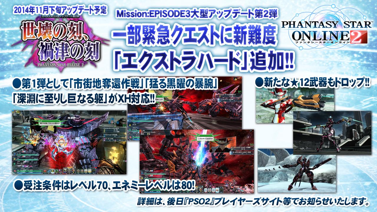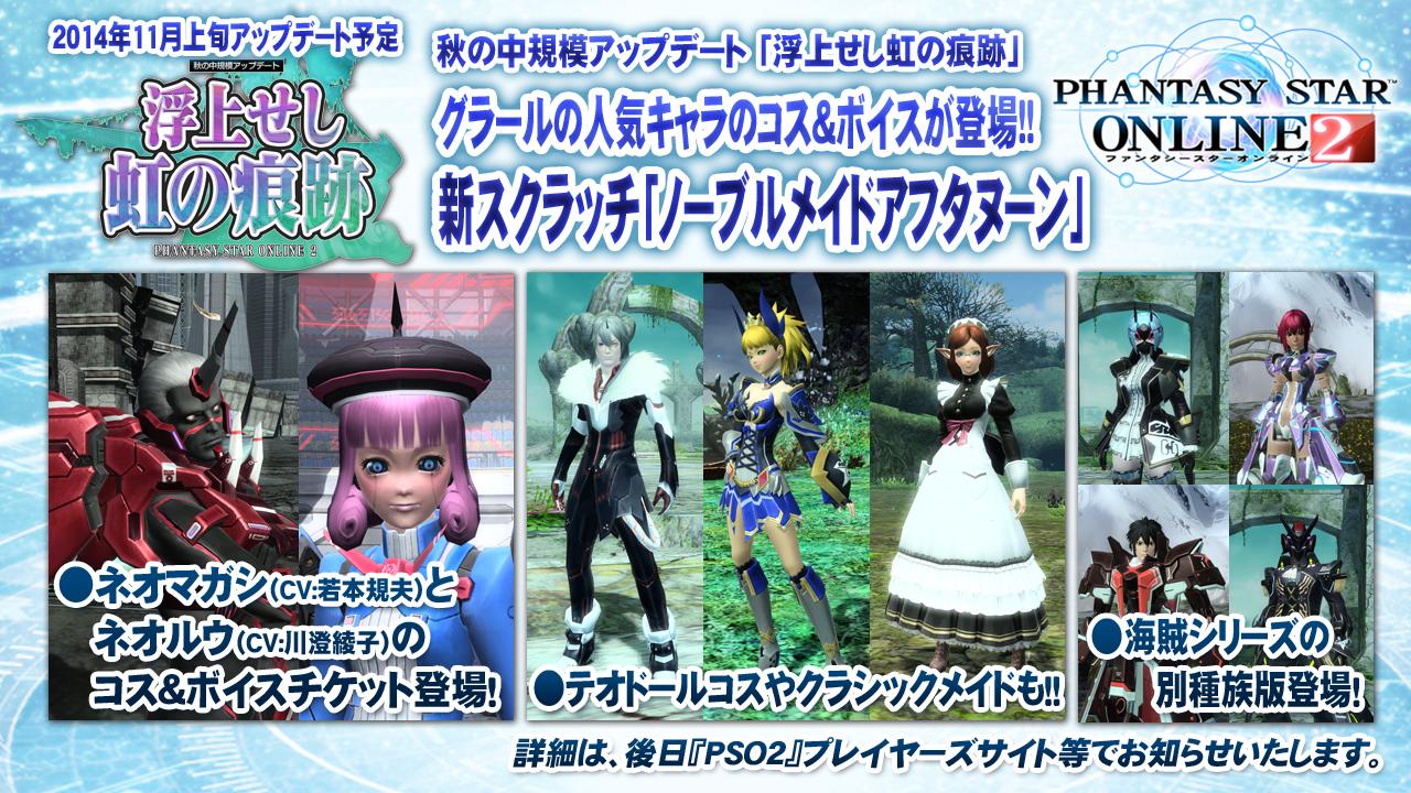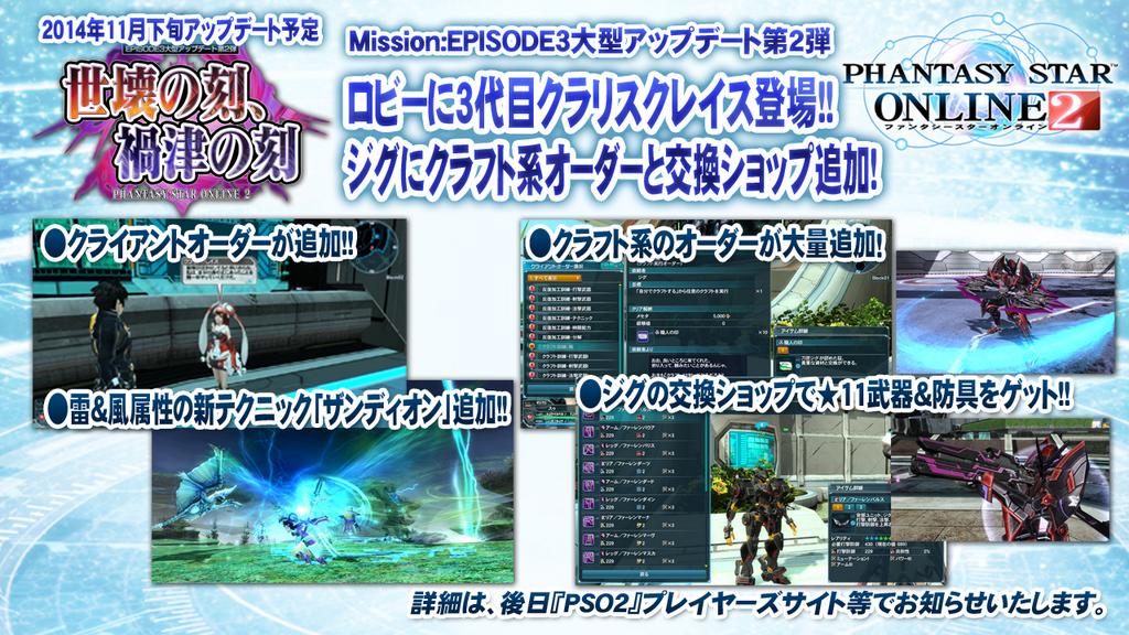 気になったポイントをピックアップ 前半の11月末のアップデート情報 「世壊の刻、禍津の刻」の内容が濃すぎる PVなど動画はこちら PSO2 『PSO2放送局』第25回 動画まとめ のこと ゲーム内キーワード ![]() ゲーム内キーワードは「いもたろう」です 武器迷彩2個とカジノコインパス5個 「浮上せし虹の痕跡」Part2 大体既出情報のおさらい ガンナーの再調整についての発表があった 今日から修正 ガンナーの戦闘バランス調整と方針について 中、近距離と言うスタイルは変えない パーフェクトキーパーの条件緩和 映らなかったけど菅沼Dは涙ぐんでいた模様 「浮上せし虹の痕跡」Part3 ![]() 3チームになります 10シップなので黄色ラッピーは4シップ合同 全体的に緩和してお祭り ![]() ニャウ押し ニャウの武器迷彩もドロップ ![]() マガシ、ルゥコスチューム ボイスにはキャストのエフェクトが付いている(全種族) PSUの「ノーブルアーティナ」 海賊シリーズコスチュームの別種族用リニューアル ![]() 共闘祭クエストをリニューアル 予告専用緊急クエスト「造龍集う死の海域」 エネミーはすべてブースト状態 ナイトギアも出るので多スロが狙いやすい 「世壊の刻、禍津の刻」 11月下旬配信 まりんかが11月19日とポロっと言ってしまう ![]() お団子バズーカはマグの攻撃 おなじ見た目のアクセサリもある ![]() お帽子様ことGH440 ニャウスーツはカジノで2万枚 ![]() ユニットクラフトはHPやPPに特化したクラフトが出来る様に レベル3,8,10の時に選べる 特殊能力追加 素材は5つまで選べるように! 特殊能力数もベースアイテム以上なら素材として選択可能に メセタは非常に高い ![]() エステ外でのアクセサリー変更が可能に 位置変更はエステでしかできない フレンドのグループ分けが出来る様に グループ内での位置調整も出来る 戦闘不能のプレイヤーの位置通知 オプションでオンオフで選択できる 復活させるとFUNが貰える ただし一日で貰える上限はある ![]() クラスレベル75 サブクラスは55まで経験値が入るように エクスキューブが変更、クラスエクスキューブに ハンターの場合は「Huエクスキューブ」 普段のエクスキューブとしても使える スキルポイントがもらえるオーダーで要求される まずは+2ポイントから ハンタースキル「オールガード」 全方面ガード レンジャー、ガンナースキル「ダイブロールシュート」 ステップアタックにあたる物 テクタースキル「リバーサーフィールド」 一定時間フィールド内のキャラクターを蘇生する 範囲はムーンより狭い アルティメット向き 今の所 Lv5 HP回復率 25% 発生時間 15秒 リキャスト 900秒 でした ブレイバースキル「スナッチJAコンボ」 スナッチステップにJA 「クイックメイト」 メイトを飲むのが速くなる フォース「ロッドキープボーナス」 チャージエスケープ後チャージしていたテクニックの再発動時のPP消費なし ロッド強化していく ファイター Tダガーがスピン中に移動できる ガンナー「ワンモアタイム」 ショウタイムが切れた後もう一度ショウタイムが発動 ハイタイムが最大の状態で発動 ![]() アルティメットクエストで入手できるPA LV1は交換所で貰える ソードPA「イグナイトパリング」 フォトンアート開始時にJGを成功させると威力向上 ランチャーPA「スフィアイレイザー」 PPあるだけ打てるビーム AISのビームのような感じ ジェットブーツPA「ヴィントジーカー」 派生はまだ秘密 ![]() ロビーにクラリスクレイスがあらわれてクライアントオーダー追加 新テクニック「ザンディオン」 雷と風の複合属性を開発する ドロップは無い 雷と風両方の弱点に効く 元威力は低めだが両方のマスタリーを付けると伸びる 使用中は無敵 使用条件がありテクニックを使う事でゲージを貯めて使用可能に 両手に雷と風を持ってあわせてあわせて・・・ ってのを菅沼Dがやりたがっていた あれの許可は取ってません ジグのクラフトオーダーで手に入るアイテムと交換 ジグの交換品は★11武器&防具がセット効果付き 4種1セットでサイキ並みに ただし、このオーダーで同時に貰えるのは1カテゴリのみ リサイクルすることで持ち替えられる ![]() エクストラハード(XH) ウルトラハードにしなかった理由はアルティメットと文字が被るため 受注条件レベル70、エネミーレベルは80 市街地とエルダーがまずXHに対応、順次増やしていく 新たな★12が今までなかったカテゴリに追加 ツインマシンガンとワイヤードランス 市街地は全てのエネミーから★12がドロップする可能性がある 今後XH緊急はそれぞれ一個づつ★12が用意される ![]() 12人用超難度常設クエスト チケット制ではなく制限は無し 12人いなくてもプレイできる 途中参加も可 12マルチパーティエリアが1つだけ 合流までに死ぬ可能性があるので人のいる場所を選んで指定してテレポートできる フリークエストに近い? 氷属性の弱点が多い ダーカーは光 経験値は不味い、オーダー無い レア掘りの為のクエスト ポイントを2000稼ぐとクリアにはなるが 一区切りの為で別に続